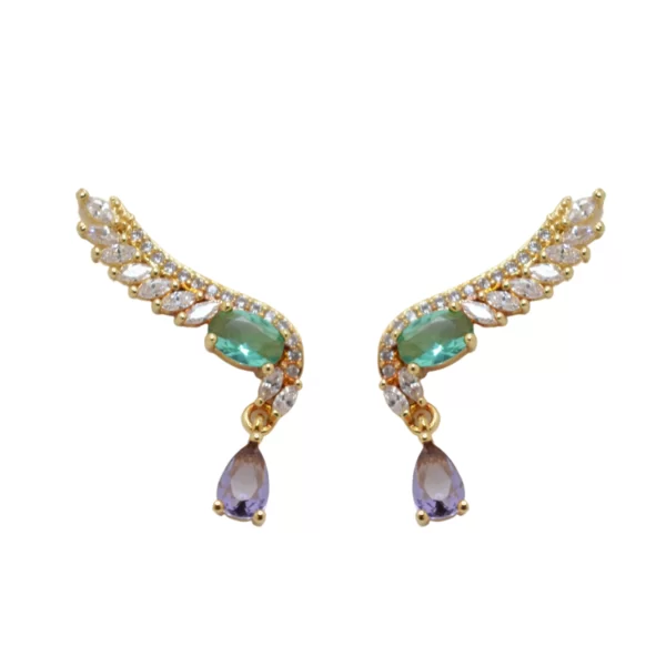 BRINCO ASA CRISTAL COM ZIRC OVAL VERDE E ZIRC DE GOTA ROXA NA PONTA